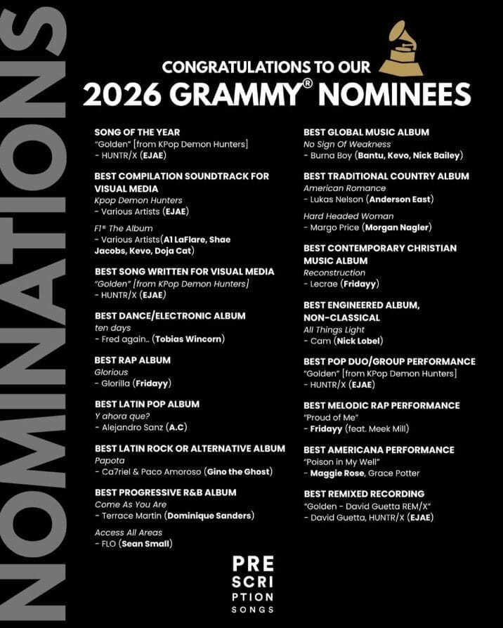 Prescription Songs is marking a landmark year at the 68th Annual GRAMMY® Awards, earning recognition across an impressive range of categories that span Pop, Dance/Electronic, R&B, Rap, Latin, Country, Americana, Global Music, Visual Media, and more. With dozens of contributions from its roster, the independent publishing powerhouse remains one of the most widely represented music companies in this year’s nominations.